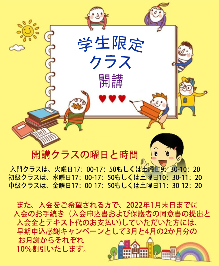 語学堂ではこのたび、小学5年生~高校2年生までを対象とした学生限定のクラスを新しく開講することになりました。学生限定ですので、興味や目的を共にする同じ年頃のお友達もできますし、お互いに切磋琢磨しながら韓国語の習得を目指しませんか? カタカナハングルは卒業して、かっこよくハングルを読んだり書いたり話したいなーと思ってる学生さん、大好きなアイドルの歌詞がわかるようになりたい学生さん、字幕なしでドラマや映画、バラエティを理解したい学生さん、語学堂で韓国語を学びましょう!韓国コスメが好きな学生さんは翻訳機を通さなくてもコスメについて自分の力でもっと知ることができますよー。将来的に韓国への留学を考えている学生さんも大歓迎です。韓国語がわかる!は楽しいですし、わかるということは、自分の可能性を広げていく力強いツールになります。ぜひこの機会に韓国語ちょっと本気で学んでみませんか? 入門クラスは、ハングルは初めてか少し文字がわかる方向けのクラスで、ハングルの成り立ちから学習します。最初からネイティブの発音に触れることで正しい発音が身につきますよ。 初級クラスは、簡単な文章がわかり、また文字の読み書きがある程度の速さでこなせる方向けのクラスです。このクラスから少し複雑な文法なども入ってきます。旅行などでの韓国人との会話が不便なく使いこなせるレベルを目指します。 中級クラスは、日常会話が不便なくこなせる方向けのクラスです。よりネイティブに近づいていくステップにあたりますので、ニュースなどを聞いてもある程度の聞き取りと理解が可能であり、長い文章を書ける力を養い、より専門的な韓国語を使いこなせるレベルを目指します。 どのクラスも1人~8人の少人数制です。また、レッスン時間は、集中しやすいように学校の授業と同じ50分間です。また、語学の習い事は、お月謝が高額になりがちですが、語学の上達には、休まず続けることが何よりも大切と考えている語学堂では、続けやすいお月謝で通っていただけるよう比較的リーズナブルなお値段でお月謝を設定しております。 開講クラスの曜日と時間は次のようになります。 入門クラスは、火曜日17:00-17:50もしくは土曜日9:30-10:20 初級クラスは、水曜日17:00-17:50もしくは土曜日10:30-11:20 中級クラスは、金曜日17:00-17:50もしくは土曜日11:30-12:20 クラスは固定制ですので、平日夕方のレッスンと土曜のレッスンのどちらかだけの受講になります。両方の受講や、日によって都合のいいほうを選ぶといったことはできませんのでご注意ください。ただし、入門と初級を並行して受講したい、といったご希望があれば、この限りではございません。その場合、2クラス分のお月謝が発生することはご了承ください。事前のレベルチェックテストを受けていただいてからレベルが決定しますので、レベルチェックテストは必ずお受けください。あくまでもレベルチェックテストですので、合否などはございません。 開講は、2022年3月~です。新クラスがスタートする前に、下記の日程で無料体験レッスンを開催いたします。ご都合のいい日をお選びください。ご参加には予約が必要です。 12月18日(土)・1月22日(土)・2月12日(土) 入門9:30-10:00、初級10:30-11:00、中級11:30-12:00 12月21日(火)・1月25日(火)・2月15日(火) 入門17:00-17:30 12月22日(水)・1月26日(水)・2月16日(水) 初級17:00-17:30 12月24日(金)・1月21日(金)・2月18日(金) 中級17:00-17:30 また、入会をご希望される方で、2022年1月末日までに入会のお手続き(入会申込書および保護者の同意書の提出と入会金とテキスト代のお支払い)していただいた方には、早期申込感謝キャンペーンとして3月と4月の2か月分のお月謝からそれぞれ10%割引いたします。 たくさんのご参加お待ちしています。 ご不明な点、お問い合わせは、事務局さかもとまでおたずねください。 080-5354-4637(受付時間平日9:00-15:00) 時間外のお問い合わせは、SMSでお願いいたします。2日以内にお返事いたします。